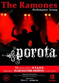 Križevačka udruga K.V.A.R.K. unazad 13 godina svog djelovanja radi na razvoju nezavisne kulture, mladih i civilnoga društva. Tim povodom i prigodnim obilježavanjem datuma u Klubu kulture koncert će sutra, u subotu 4. svibnja 2013. održati domaće skupine Porota i The Ramones Perfomance Group. Nakon prošlogodišnjeg povratničkog koncerta Porote u sastavu Marko Šimonek, Matej Jakopović, Miodrag Prelec, Frano Homen i Tomislav Tenodi – ova križevačka rock skupina ponovo izlazi na pozornicu. Uz njih na domaćem terenu biti će i The Ramones Perfomance Group u sastavu Saša Huzjak, Saša Lončarić, Ivan Katanović i Vinko Prodan – koja donosi najbolje od Ramonesa. Cijena ulaznice iznosi 20 kuna, a vrata Kluba kulture se otvaraju u 21 sat.