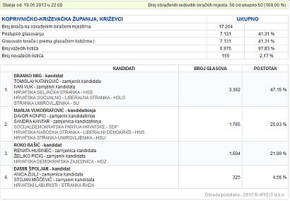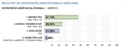 Prema privremenim neslužbenim rezultatima za lokalne izbore 2013. koje je objavilo Državno izborno povjerenstvo u 22 sata, nakon 100% obrađenih biračkih mjesta u Gradu Križevcima najbolji rezultat za gradonačelnika polučio je kandidat HSS-a, HSLS-a i Stranke umirovljenika Branko Hrg s osvojenih 47,15% glasova, dok je kandidatkinja SDP-a, HNS-a i HSU-a Marija Vukobratović osvojila 25,03% glasova. Na trećem mjestu je kandidat HDZ-a Roko Bašić s 21,09% osvojenih glasova, dok je kandidat Hrvatskih laburista Damir Špoljar osvojio 4,56% glasova. U Križevcima je glasovanju pristupilo 41,31% od ukupno 17.216 birača. Prema ovim neslužbenim rezultatima, dvoje najbolje plasiranih kandidata – dosadašnjeg gradonačelnika Hrga i saborsku zastupnicu Vukobratović očekuje drugi krug izbora za dva tjedna, u nedjelju 2. lipnja.
