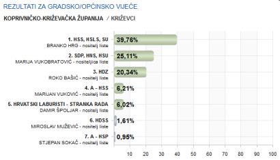 U izboru za Gradsko vijeće Grada Križevaca, prema podacima Državnog izbornog povjerenstva nakon obrađenih svih 50 biračkih mjesta, lista koalicije HSS-HSLS-SU osvojila je 39,76% glasova, dok je lista koalicije SDP-HNS-HSU druga s 25,11%. Treći je HDZ s 20,34% osvojenih glasova, četvrti A-HSS sa 6,21%, dok su Hrvatski laburisti peti s 6,02% osvojenih glasova. Na začelju su HDSS sa 1,61% i A-HSP sa 0,95% osvojenih glasova. Prema ovim rezultatima od 21 mjesta u križevačkom Gradskom vijeću 9 ide koaliciji HSS-HSLS-SU, 6 ide koaliciji SDP-HNS-HSU, 4 pripada HDZ-u, dok su po jedno vijećničko mjesto osvojili Hrvatski laburisti i HDSS.