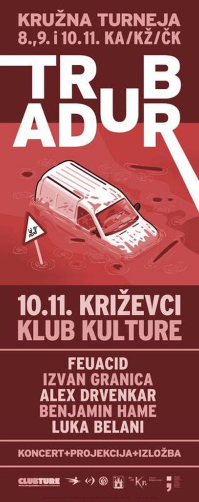 Večeras od 20 sati u križevačkom Klubu kulture će se održati završni program trodnevne kružne turneje Trubadur, u sklopu kojeg će uživo nastupiti križevački kantautor i rock-pjevač Luka Belani i hard-rock sastav Feuacid iz Čakovca. Svirkama će prethoditi projekcije kratkih filmova autora Alexa Drvenkara i Benjamina Hamera: Izvan granica, Catch my hoop, Chocholate makes everyone happy, Area 40000. Isti autori će također postaviti izložbu s nazivom “Black Hole”. Kružna turneja Trubadur predstavlja svojevrsnu suradnju klubova mladih i alternativnih kulturnih scena triju hrvatskih gradova – Karlovca, Križavaca i Čakovca, čiji cilj je oživljavanje javnog prostora, promoviranje „nepopularne“ kulture te uspostavljanje izravnog kontakta s lokalnim umjetnicima. Ulaz je slobodan.