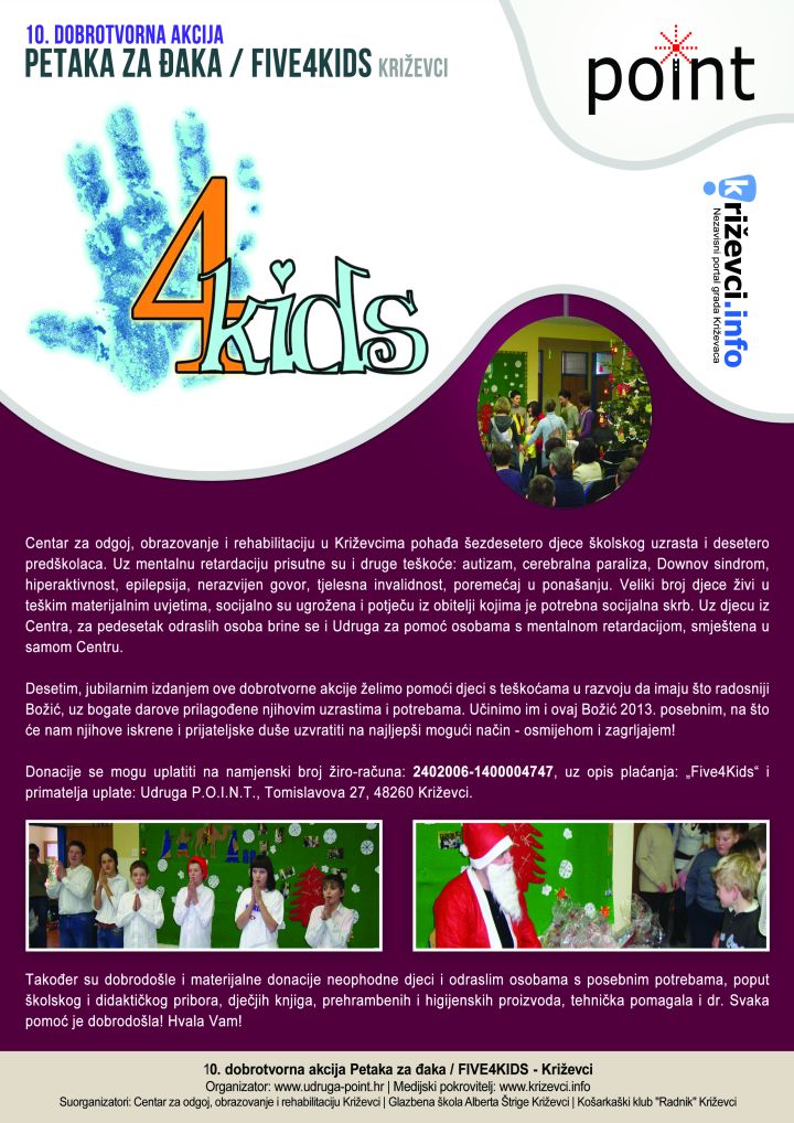 Zahvaljujući akciji FIVE4KIDS, stodvadesetak osoba s teškoćama u razvoju iz Križevaca već devet godina zaredom ima radosniji Božić, uz bogate darove prilagođene njihovim uzrastima i potrebama. Učinimo im i ovaj Božić 2013. posebnim, na što će nam njihove iskrene i prijateljske duše uzvratiti na najljepši mogući način – osmjehom i zagrljajem!