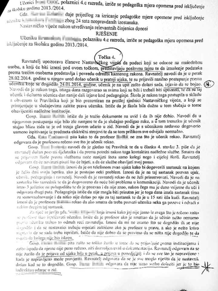 Nekoliko dana kasnije slučaj se našao i na sjednici nastavničkog vijeća pod točkom 4 – izvješće o stanju u školi. U izvješću sa sjednice stoji ravnateljeva izjava kojom upozorava članove nastavničkog vijeća da “podaci koji se odnose na malodobnu osobu, a koji će biti izneseni pod tom točkom, predstavljaju poslovnu tajnu te da iznošenje podataka prema trećim osobama predstavlja povredu odredbi kaznenoga zakona”.
