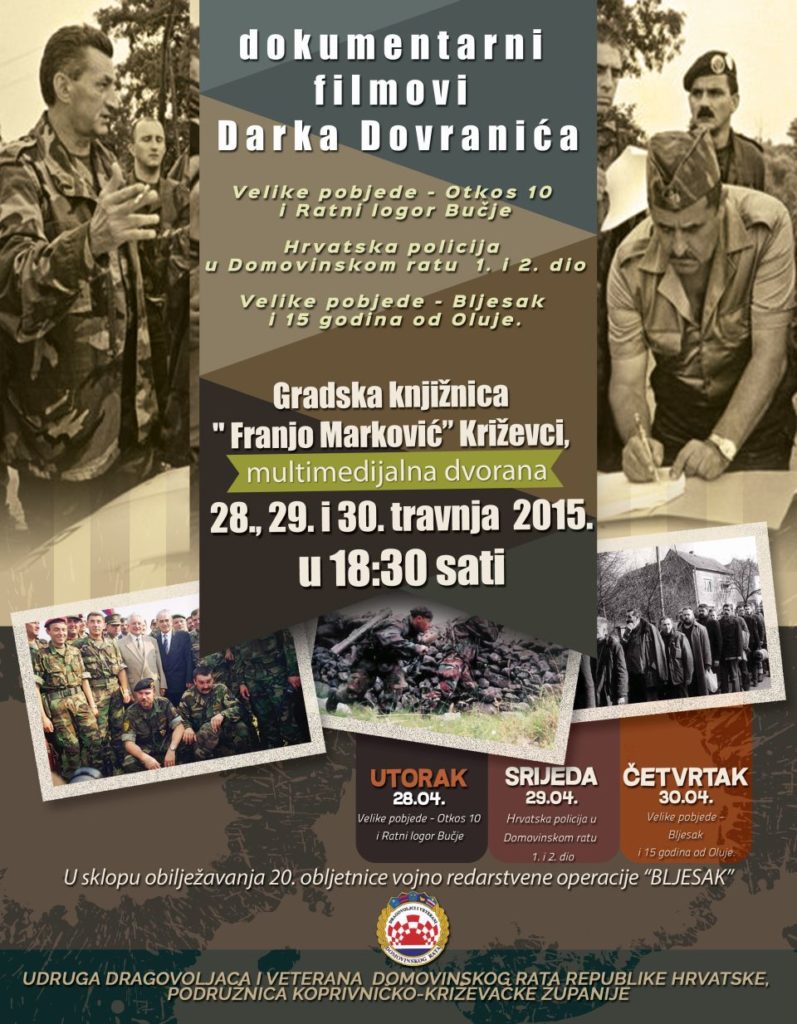 Udruga dragovoljaca i veterana Domovinskog rata Republike Hrvatske, podružnica Koprivničko-križevačke županije u sklopu obilježavanja 20. obljetnice vojnoredarstvenih operacija „Bljesak“ i „Oluja“ priprema prikazivanje dokumentarnih filmova režisera i scenarista Darka Dovranića iz ciklusa posvećenog Domovinskom ratu. Prikazivanje filmova započinje sljedeći tjedan u Multimedijskom kulturnom centru Gradske knjižnice „Franjo Marković“ u Križevcima.