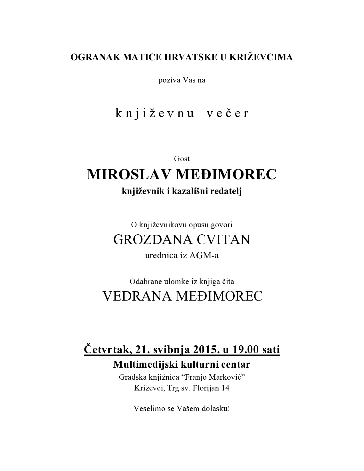 O gostu: redatelj, pisac, dragovoljac i diplomat Miroslav Međimorec (Zagreb, 1942.) diplomirao je komparativnu književnost i engleski jezik 1964. godine, a kazališnu režiju 1973. godine. Iste godine bio je na poslijediplomskom kazališnom studiju u „Royal Shakespeare Company“. Doktorirao je teatrologiju na Filozofskom fakultetu u Zagrebu. Na prvoj godini studija počeo se baviti kazalištem u zagrebačkom SEK-u. Proslavio se režijama predstava: Ars longa, vita brevis (1967.) i Vietrock (1968.), koje je mlada publika doživljavala kao svoj manifest. Kao profesionalan redatelj u statusu je slobodnog umjetnika (1965.-1985.) i stalnog redatelja u DK Gavella (od 1985. do 1991.), režirao preko sedamdeset kazališnih predstava, desetak radio-drama, adaptirao je i za televiziju snimio nekoliko predstava. Hrvatski je branitelj, dragovoljac, visoki časnik HV-a i djelatnik Ministarstva obrane i Ministarstva vanjskih poslova RH, HIS-a, veleposlanik, danas umirovljenik. Objavljuje drame, priče, romane, teatrološke tekstove i studije o Domovinskom ratu. Knjige: romani Piše Sunja Vukovaru (2004.), Frankfurtska veza (2004.), Presvijetli i rabin (2006.), Lovac na generala (2013.); knjiga drama Tužni hrvatski san. Svrha od slobode, osim kao Kušanov dramski komad pisan za Dubrovačke ljetne igre 1971. može biti i ukupan naslov Međimorčevih nastojanja u kazalištu od prve njegove režije do danas. A Svrha od slobode, tekstualna i sudbinska, nastala je kao prijedlog što ga je u pismu toga proljeća iz Njemačke uputio dekan, profesor, redatelj i autoritet Kosta Spaić. Knjiga Kostino pismo (Svrha od slobode) priča je o jednoj generaciji umjetnika koja je realizirala Kostin prijedlog, o prijedlogu koji je ostavio dalekosežne posljedice na mnoge životne priče, a posebice na onu redatelja predstave i autora knjige. Ona je ljudsko, umjetničko i potresno svjedočenje o odlascima umjetnika, prolaznosti i vremenu koje živi u sjećanju dvije vrste ljudi: onih koji su vrijeme kreirali i onih koji su tim kreacijama pljeskali. Dobitnik je brojnih nagrada za režiju na kazališnim festivalima i smotrama. Dobitnik je i godišnje nagrade za najbolji roman iz Domovinskog rata (2004.) i godišnje nagrade za prozu Dubravko Horvatić (2006.).