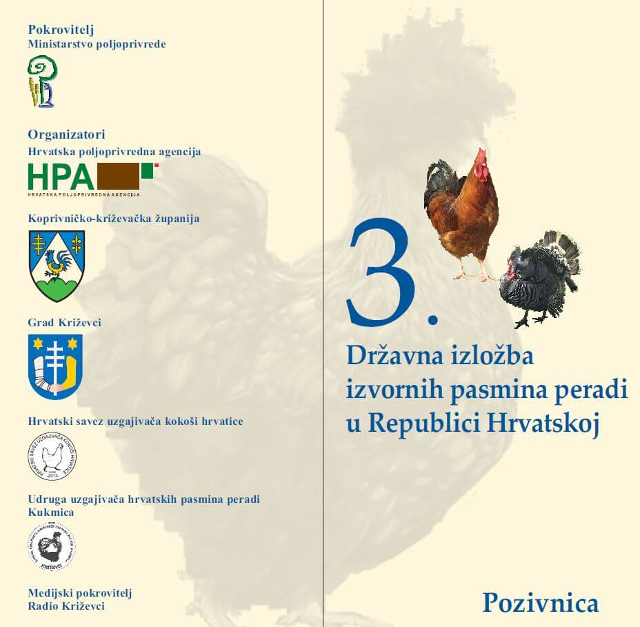 Hrvatska poljoprivredna agencija poziva na 3. Državnu izložbu izvornih pasmina peradi u Republici Hrvatskoj, koja će se održati u nedjelju, 25. listopada 2015. godine u Križevcima, Trg Sv. Florijana 17-Vojarna, s početkom u 10 sati.