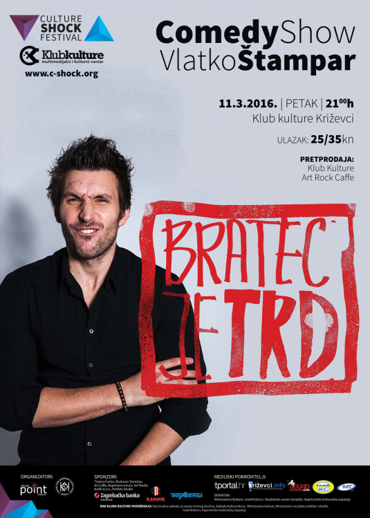 U petak 11. ožujka u 21 sat u križevačkom Klubu kulture će se u sklopu 12. Culture Shock Festivala održati stand-up show Vlatka Štampara s naslovom “Bratec je trd”. Već znamo da će ovo biti rasprodano. Znate zašto? Zbog Vlatkova načina na koji priča o odrastanju, problemima u školi, dolasku u Zagreb iz rodnog Čakovca, muško-ženskim odnosima, seksu i drugim, globalno zanimljivim temama. Njegova bogata mašta, te pomaknut i iznimno duhovit pogled na svijet otkrivaju komičara koji će vas, vjerovali ili ne, nasmijati više od svih članova Vlade RH zajedno! Ulaznice po cijeni 25 kuna su u pretprodaji u Art Rock Caffeu ili rezervacijom na tickets@c-shock.org, dok će na dan predstave, ako koja ostane, koštati 35 kn.