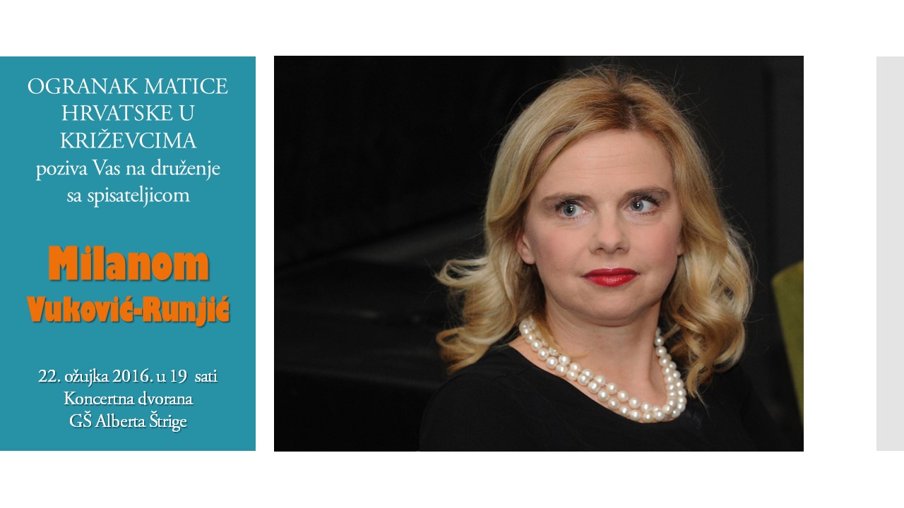 Ogranak Matice hrvatske poziva u utorak, 22. ožujka 2016. u 19 sati u Koncertnu dvoranu Glazbene škole Alberta Štrige na druženje sa spisateljicom Milanom Vuković-Runjić, s kojom u Križevce stižu i sve „Proklete Hrvatice“, njih dvadeset koje su živjele, radile, vladale i pritom mijenjale svijet oko sebe u prethodnih 500 godina – od slavljene Cvijete Zuzorić i naše Sidonije Erdődy Rubido pa sve do nezaboravne Ene Begović. O knjizi “Proklete Hrvatice” govorit će Daniel Rafaelić i autorica Milana Vuković-Runjić.