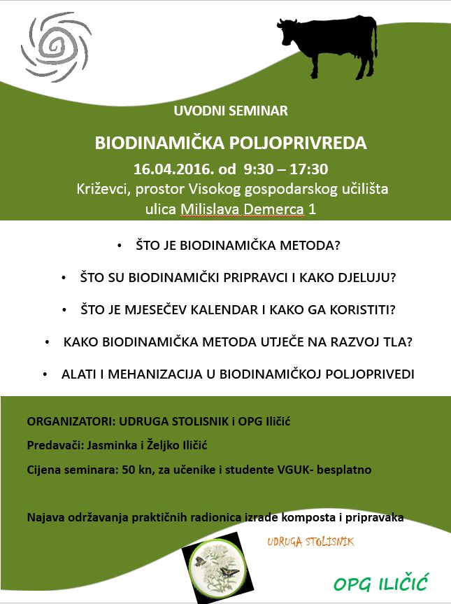 Jednodnevni seminar o biodinamičkoj poljoprivredi se održava u Križevcima u subotu 16. travnja 2016. godine u vremenu od 9:30 do 17:30 sati, u organizaciji Udruge za istraživanje, promicanje i razvoj biodinamičke poljoprivrede “Stolisnik” iz Zagreba te OPG-a Iličić. Mjesto održavanja je Visoko gospodarsko učilište Križevci, Milislava Demerca 1. Cijena seminara za polaznike je 50 kuna, dok je za studente i profesore VGUK-a besplatno, uz obavezno popunjavanje prijavnice. Za prijave, sve nejasnoće i pitanja zainteresirani su se slobodni obratiti e-poštom ili broj mobitel 091/1714-395 (Ljiljana Kos). Broj polaznika seminara je ograničen.