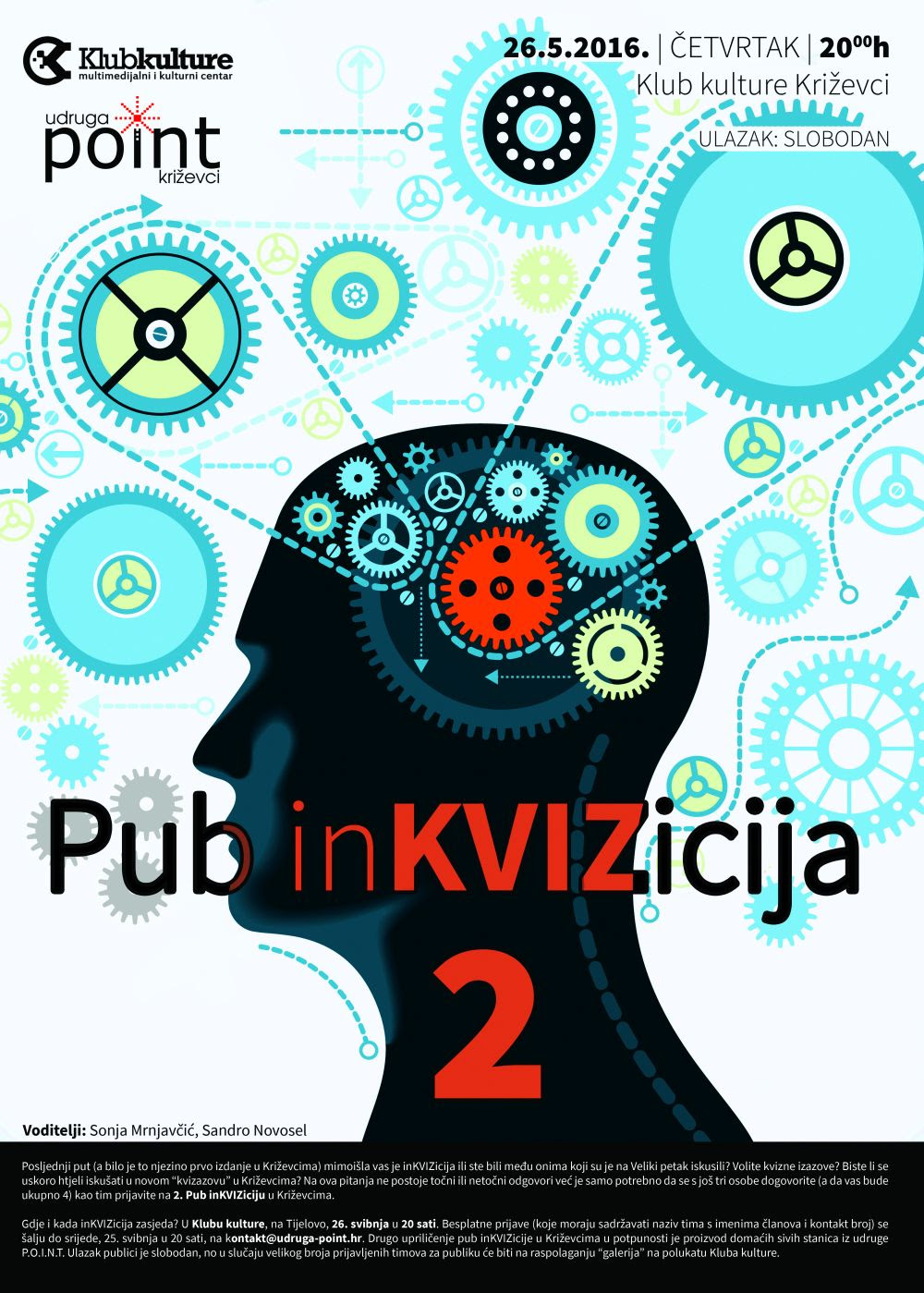 Još uvijek traju prijave na večerašnji kvizni izazov “Pub inKVIZicija 2” koji će se održati u Klubu kulture s početkom u 20 sati. Četveročlane ekipe mogu se besplatno prijaviti na kontakt@udruga-point.hr slanjem naziva ekipe s imenima članova i kontakt brojem, a organizatori iz udruge P.O.I.N.T. upozoravaju da je broj ekipa ograničen! Za publiku će biti na raspolaganju “galerija” na polukatu Kluba kulture. Voditelji večeri su Sonja Mrnjavčić i Sandro Novosel, a medijski pokrovitelj događaja je nezavisni portal www.krizevci.info.
