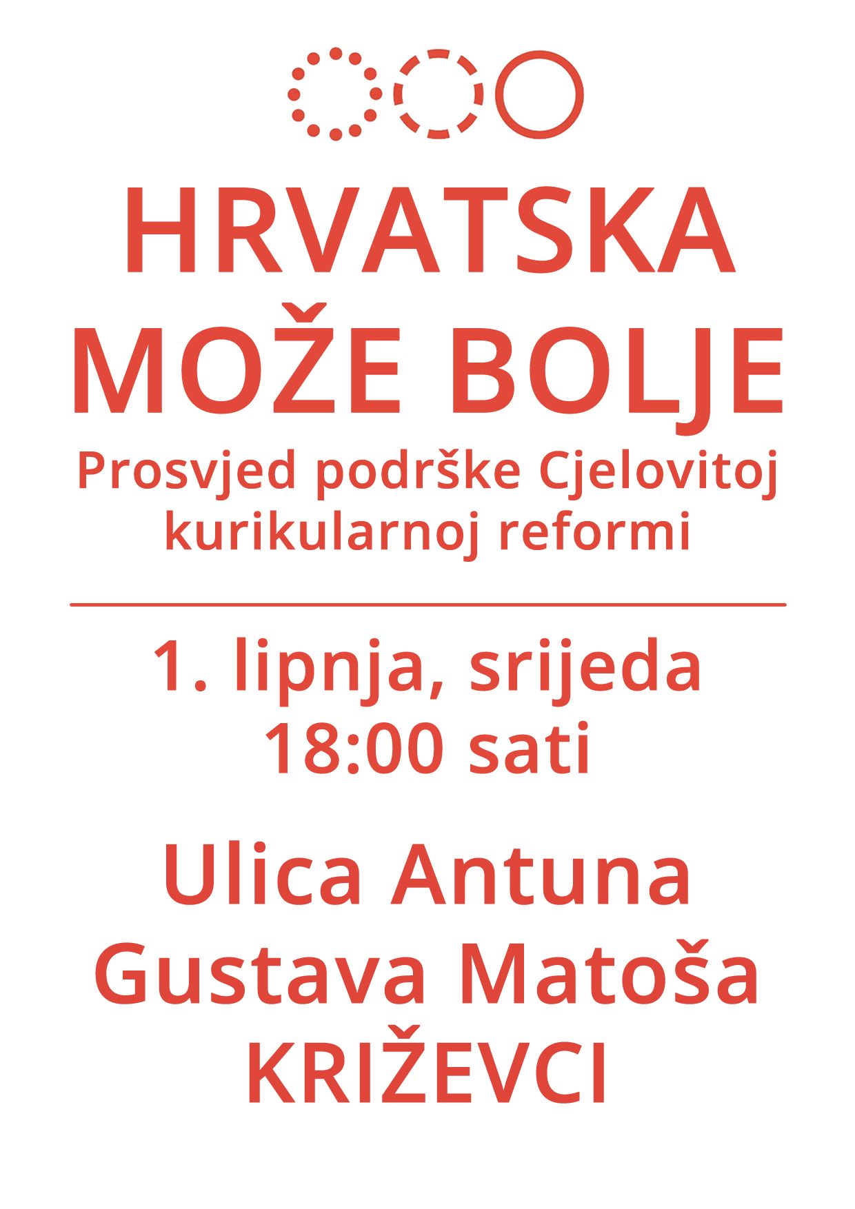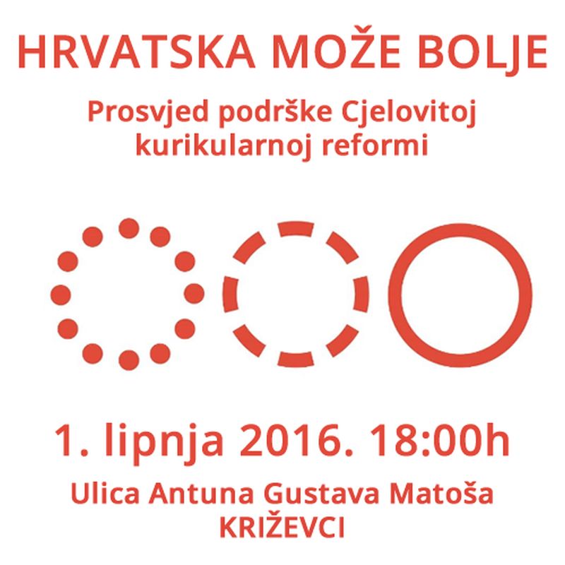 Inicijativa “Hrvatska može bolje” okuplja više od 250 različitih udruga, sindikata, entuzijastične učitelje i učiteljice te pojedince zainteresirane za kvalitetno obrazovanje. Pozivaju građanke i građane Hrvatske da danas, u srijedu 1. lipnja 2016. godine u 18 sati, na Međunarodni dan roditelja, na prosvjedu na Trgu bana Josipa Jelačića u Zagrebu i diljem Hrvatske i svijeta iskažu podršku sustavnoj i kvalitetnoj provedbi reforme obrazovanja i Cjelovitoj kurikularnoj reformi bez političkih pritisaka.