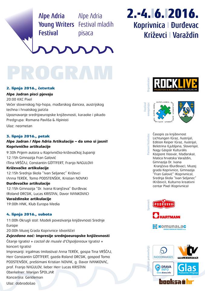 U četiri grada kontinentalne Hrvatske – Koprivnici, Križevcima, Đurđevcu i Varaždinu, od danas do subote se održava Alpe Jadran Festival mladih pisaca koji okuplja mlade književnike iz četiri države Europske unije – Mađarske, Austrije, Slovenije i Hrvatske. Na festivalu će sudjelovati devet autora koji će imati niz javni čitanja u školama čime će se mladima u formativnim godinama pružiti uvid u suvremenu srednjoeuropsku književnost, odnosno u sve različitosti, ali i sličnosti kulturnog prostora koji je u određenim povijesnim razdobljima bio dio istih političko-administrativnih cjelina.