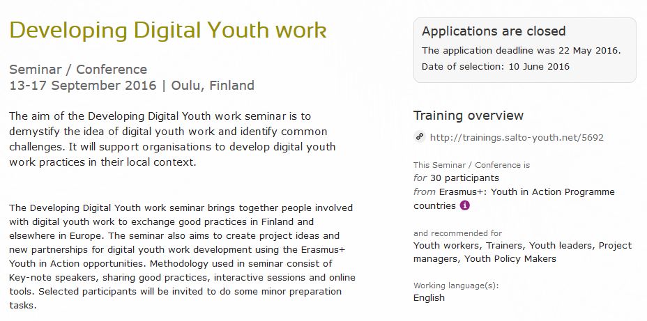 Od 13. do 17. rujna 2016. godine u finskom gradu Oulu će se održati međunarodni seminar “Developing Digital Youth Work” o razvoju digitalnog rada s mladima, na kojem će među 30 polaznika sudjelovati i član križevačke udruge P.O.I.N.T. Damjan Tkalec. Rezultat je to online selekcije koju je provela finska agencija za mobilnost mladih, a uz dvadesetjednogodišnjeg Križevčanina seminar će pohađati mladi iz Španjolske, Slovenije, Velike Britanije, Danske, Luksemburga, Švedske, Finske i drugih europskih zemalja.
