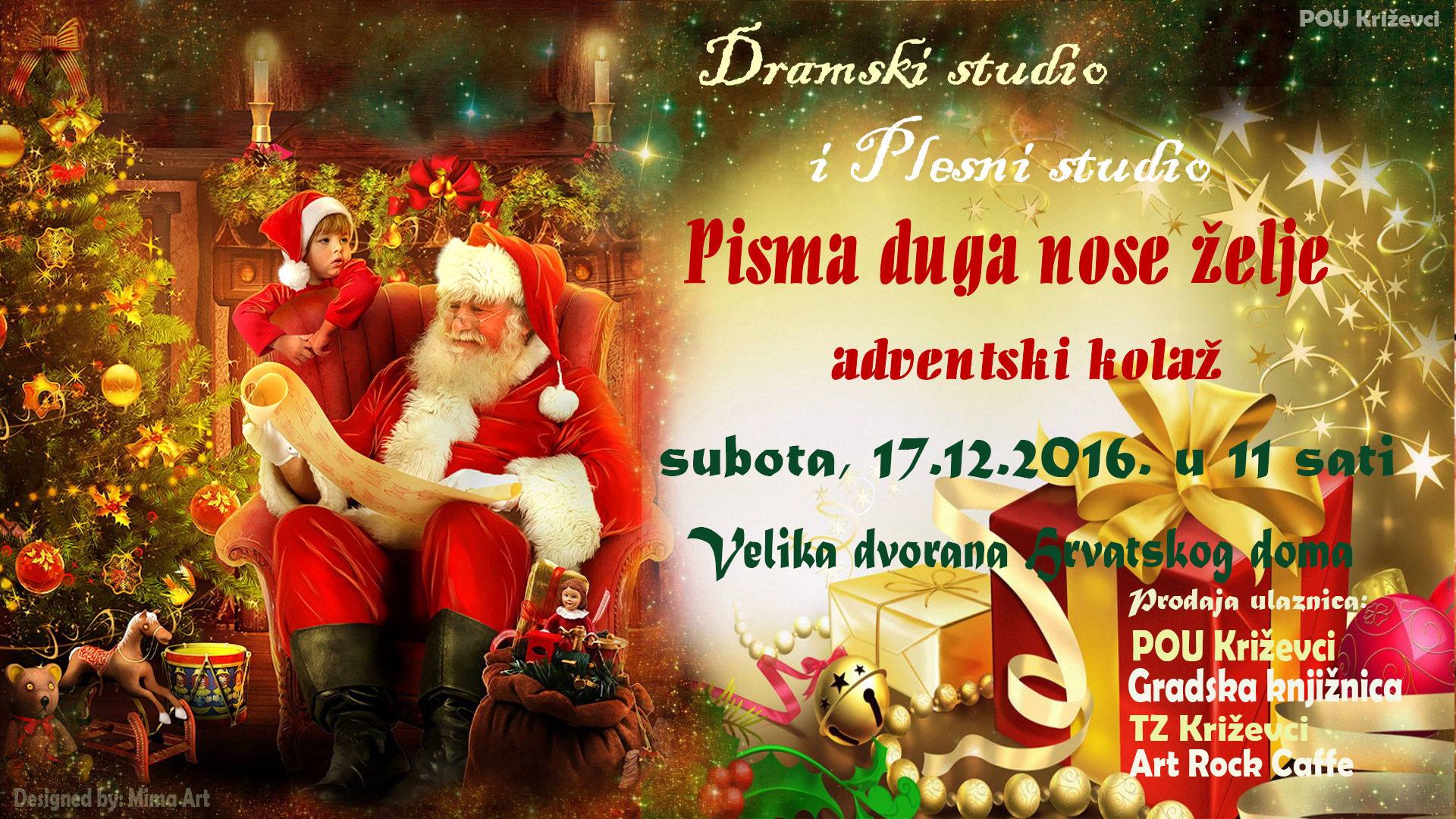 Božićno vrijeme je vrijeme isčekivanja, veselja, radosti, darivanja, sreće i pjesme. Za male i velike Križevčanke i Križevčane te njihove goste, Dramski i Plesni studio Križevci pripremili su uzbudljivu adventsku predstavu. U njoj će biti puno pjesme i plesa, djece i životinja, a najvažniji će biti Djed Božićnjak, koji je cijele godine marljivo čitao pisma i poruke pune dječjih želja.