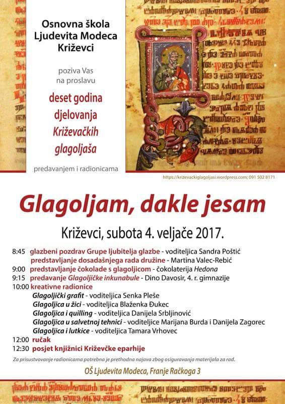 Osnovna škola Ljudevita Modeca Križevci poziva na proslavu deset godina djelovanja Križevačkih glagoljaša koje će obilježiti prigodnim programom i radionicama. Druženje u znaku glagoljice će se održati u subotu, 4. veljače u prostorijama OŠ Ljudevita Modeca na adresi Franje Račkoga 3. Za prisustvovanje radionicama potrebna je prethodna najava zbog osiguravanja materijala za rad.