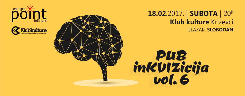 Šesto kviziranje u Križevcima, u organizaciji udruge P.O.I.N.T. starta od 20 sati. Prijave timova, koja mora sadržavati ime tima, imena do 4 člana tima, te kontakt broj, šalju se najkasnije do petka 17. 2. u 20 sati, na pubinkvizicija@udruga-poin