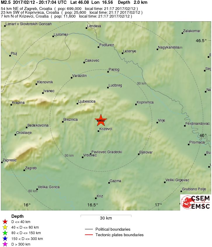 Večeras oko 21:17 sati zabilježen je umjeren potres s epicentrom 7 kilometara sjeverno od Križevaca, na području Ivanca Križevačkog. Prema prvim podacima Euromediteranskog seizmološkog centra potres je imao magnitudu M=2.5 prema Richteru. Prema izvještaju Seizmološke službe Geofizičkog odsjeka Prirodoslovno-matematičkog fakulteta u Zagrebu, na temelju magnitude je izračunat intenzitet u epicentru od IV-V (četiri do pet) stupnjeva makroseizmičke ljestvice.
