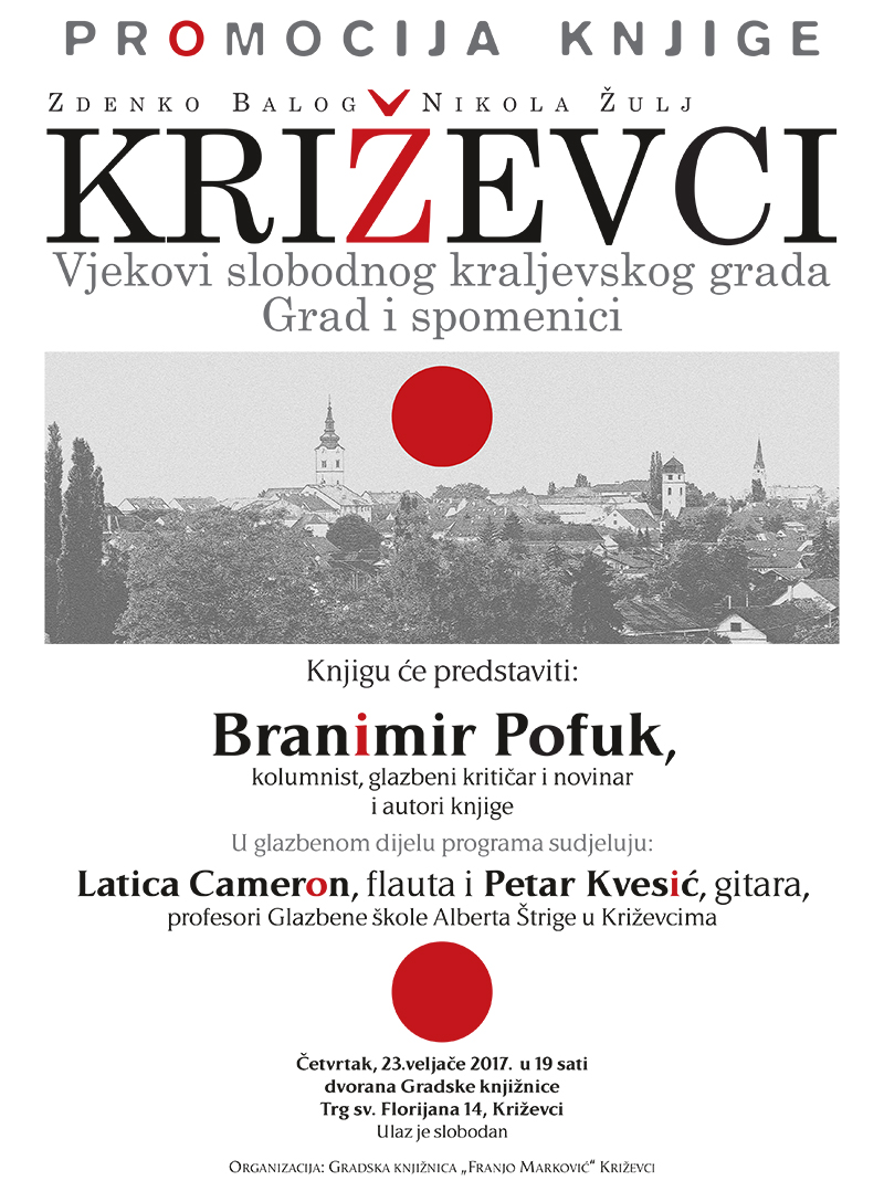 Gradska knjižnica “Franjo Marković” Križevci poziva na promociju knjige “Križevci – Vjekovi slobodnog kraljevskog grada – Grad i spomenici” autora Zdenka Baloga i Nikole Žulja, koja će se održati u četvrtak, 23. veljače 2017. u dvorani Gradske knjižnice s početkom u 19 sati.