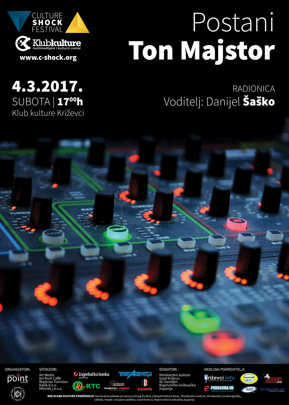 Zanima vas muzika, koncerti, rock zvijezde? Volite ići na koncerte plesati, ali vas fascinira i produkcija na pozornici? Oduvijek ste željeli naučiti čemu služe one silne tipke na mikseti koje se pomiču gore-dolje? 13. Culture Shock Festival vas poziva na besplatnu radionicu Postani ton majstor u kojoj možete naučiti sve što vas zanima o zvuku, ozvučivanju i produkciji različitih događanja.