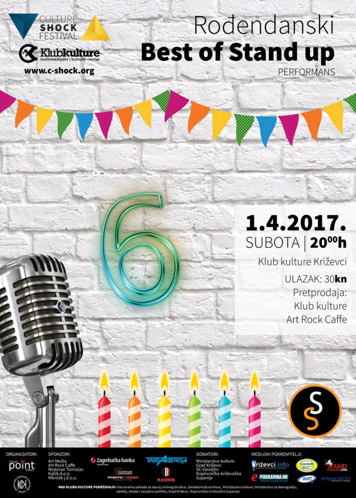 Popularni križevački stand up serijal ide u svom #razvaljotkashock modu, a povodom 13. Culture Shock Festivala i 6. rođendana Studija smijeha prvotravanjsko gostovanje u Klubu kulture u posljednji je čas pojačano pa tako umjesto dvojice u Križevce dolazi čak sedmero komičara! U programu “Rođendanski Best of Stand Up” u subotu, 1. travnja 2017. nastupit će Tomislav Primorac, Vanja Dobrijević, Ivica Lazaneo, Ante Travizi, Josip Škiljo, Saša Turković i voditelj večeri Goran Vinčić. Ulaznice po 30 kuna mogu se u pretprodaji nabaviti u Klubu kulture, Art Rock Caffeu te online putem sustava Entrio.hr.