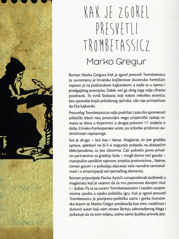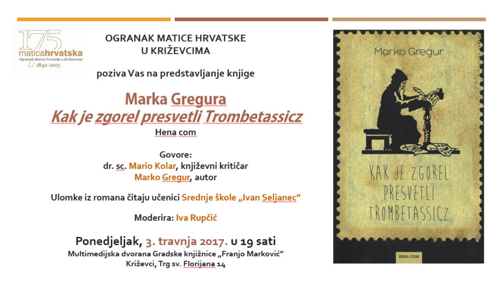 Ogranak Matice hrvatske u Križevcima poziva na predstavljanje knjige Marka Gregura „Kak je zgorel presvetli Trombetassicz” (izdavač Hena com), koje će se održati u ponedjeljak, 3. travnja 2017. u 19 sati u Multimedijskoj dvorani Gradske knjižnice „Franjo Marković” u Križevcima.