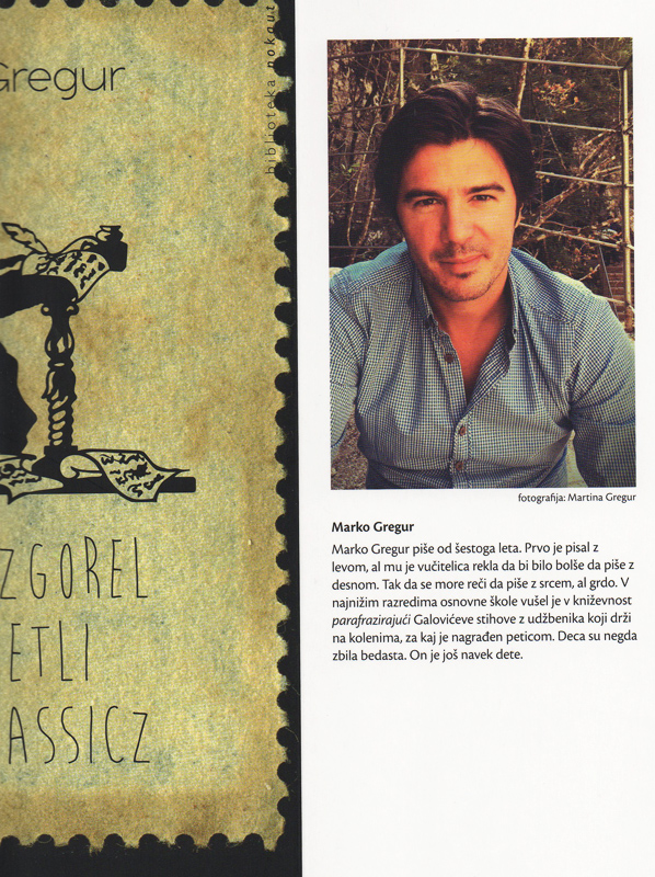 Marko Gregur rođen je 1982. godine u Koprivnici. Završio je višu ekonomsku, a trenutno je student druge godine studija odnosa s javnošću i medija. Kratke priče i poeziju objavljivao u tridesetak zajedničkih zbirki poezije i kratke proze koje su nastale kao rezultati raznih natječaja, u časopisima Kaj, Poezija, Republika, Odjek, Knjigomat, Avangrad, Re, novinama Večernji list, Vijenac, Zarez, u zborniku mladih autora (do 27 godina) s područja bivše Jugoslavije „Rukopisi 32” i „Rukopisi 33”. Kratka priča uvrštena mu je u zbirku priča o prodavaonicama ploča „Record stories” (Aquarius records, 2011.).