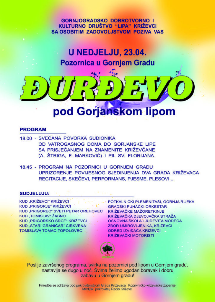 Na dan sv. Jurja, u nedjelju 23. travnja, Gornjogradsko dobrotvorno i kulturno društvo „LIPA“ iz Križevaca, po 26. puta organizira tradicionalnu svetkovinu „Đurđevo pod Gorjanskom lipom“ koja se održava kao uvod u proslavu Dana grada. Povorka u svečanim odorama i narodnim nošnjama u 18 sati kreće od Vatrogasnog doma u smjeru Gornjega grada.