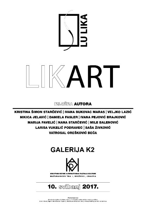 Večeras od 20 sati u Galeriji K2, u prostoru bivše igraonice u dvorištu Zagrebačke banke, održat će se otvorenje likovne izložbe autora “Likart”. Autori čiji se radovi izlažu su Kristina Šimon Starčević, Ivan Bukovac Maras, Veljko Lazić, Nikica Jelavić, Daniela Fasler, Ivana Pejović Brajković, Marija Pavelić, Nana Starčević, Mile Balenović, Larisa Vuković Podravec, Saša Živković i Vatrosal Orešković Beća. Stalni postav izložbe može se razgledati svakim radnim danom od 18 do 20 sati.
