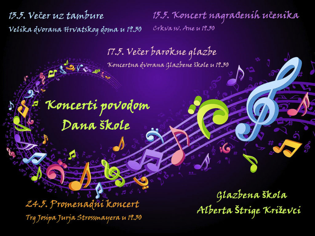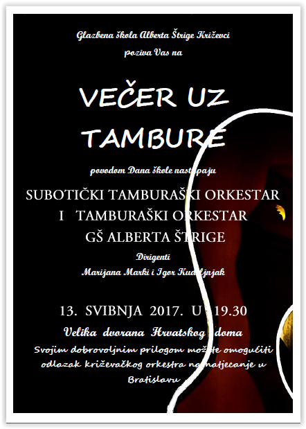 Glazbena škola Alberta Štrige Križevci poziva u subotu, 13. svibnja 2017. na veliki koncert Tamburaškog orkestra Glazbene škole i njihovih gostiju, Subotičkog tamburaškog orkestra iz Subotice. To će biti prvi od četiri koncerta kojima će se obilježiti Dan škole. Koncert će se održati u Velikoj dvorani Hrvatskoga doma s početkom u 19:30 sati.