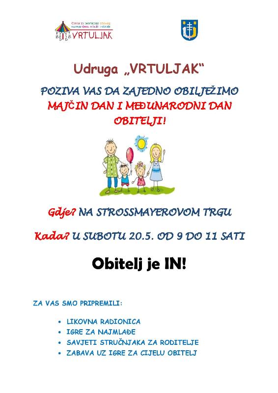 Udruga Vrtuljak poziva u subotu, 20. svibnja 2017. na Strossmayerov trg u Križevcima na obilježavanje Majčinog dana i Međunarodnog dana obitelji, koje će se održati od 9 do 11 sati. Od aktivosti organizatori su pripremili likovnu radionicu, igre za najmlađe, savjete stručnjaka za roditelje te zabavu uz igre za cijelu obitelj.