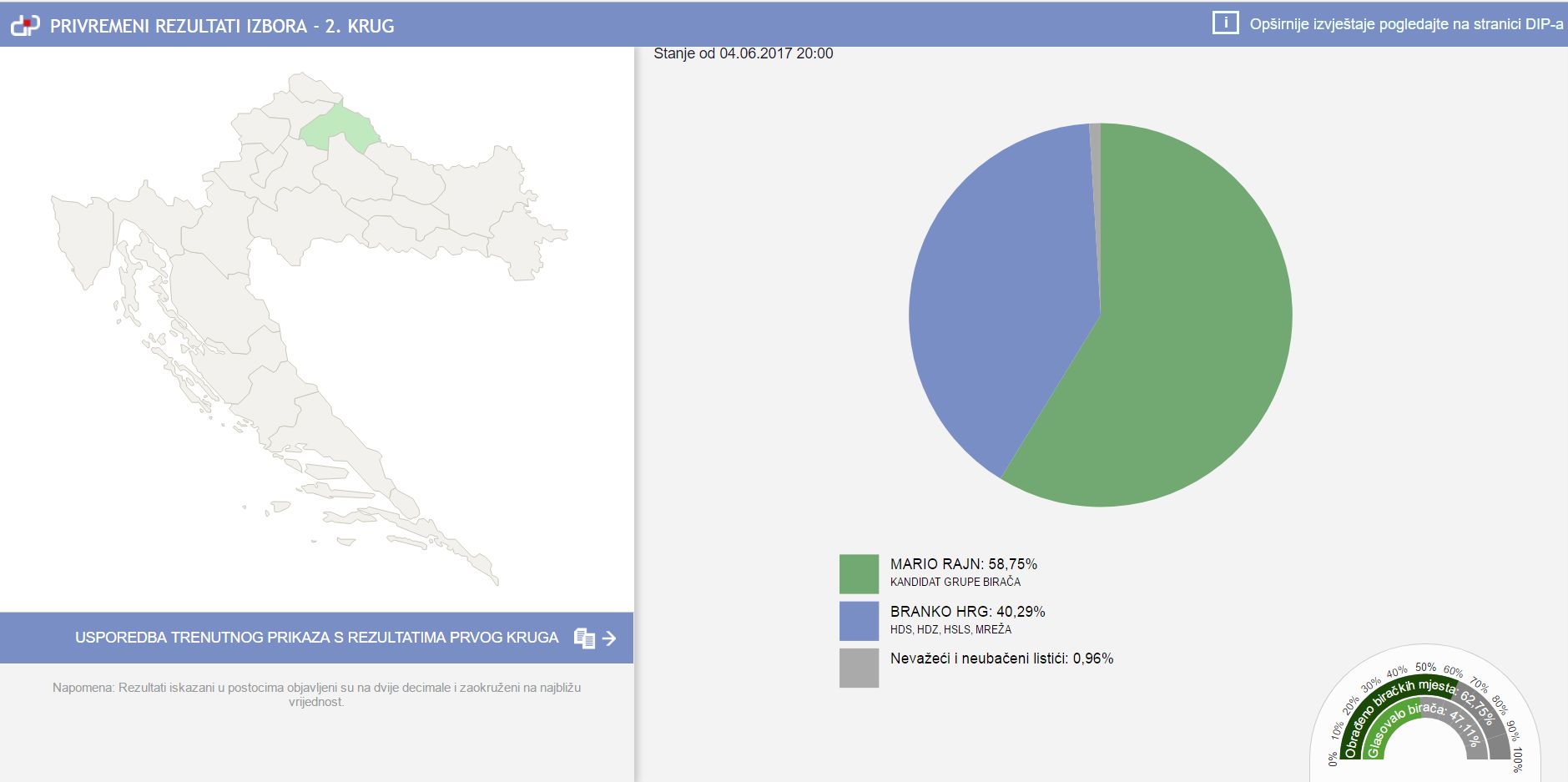 Rajn je time s osvojenih 5202 glasova birača danas izašlih na izbore (61,58 %), pobijedio Branka Hrga, kandidata stranaka HDS-HDZ-HSLS-Mreža, koji je bio gradonačelnik od 2001., a danas je osvojio 37,39 %, ili 3158 glasova.
