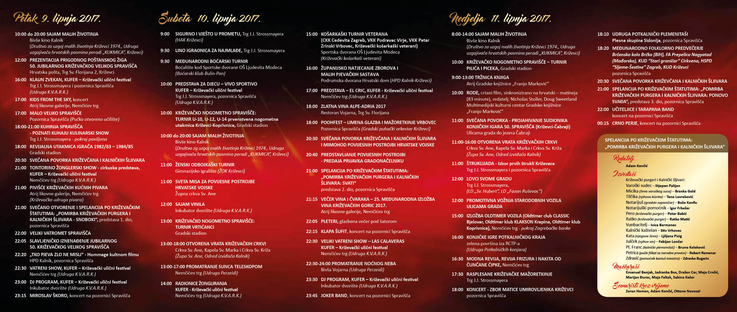 – Kako bismo ovogodišnju 50. obljetnicu održavanja manifestacije obilježili na najbolji i najveseliji mogući način, pozivamo Vas da nam se pridružite u što većem broju i budete dio ove lijepe priče iz malog, poviješću i tradicijom bogatog grada Križevaca. Vidimo se na 50. Križevačkom velikom Spravišču od 9. do 11. lipnja 2017. godine, pozvala je direktorica turističkog ureda Olinka Gjigaš.