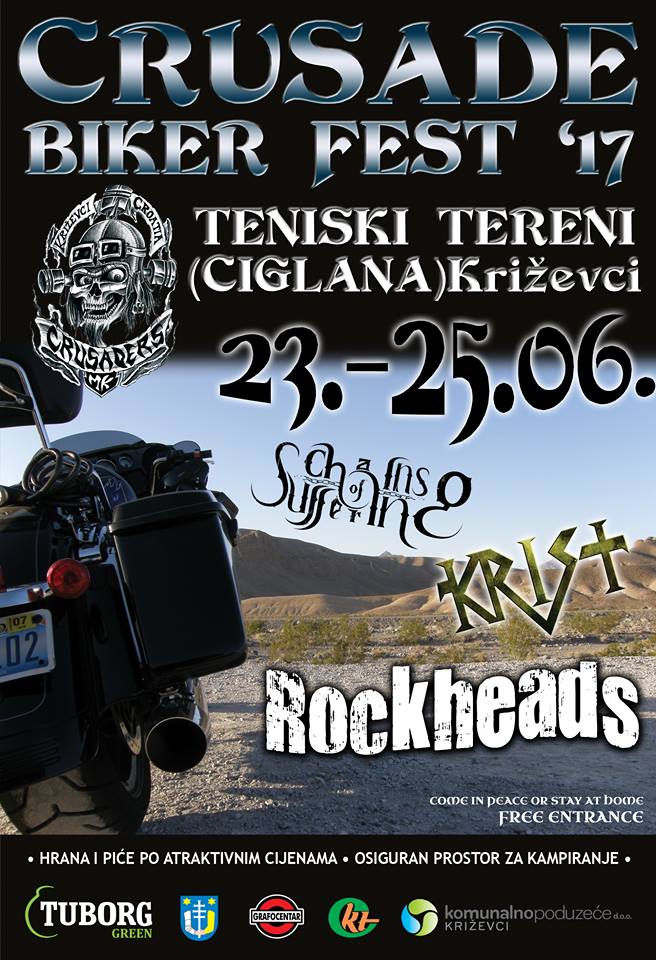 Moto klub Crusaders Križevci organizira moto-susret “Crusade Biker Fest 2017”, koji se večeras i sutra održava na teniskim terenima kod ciglane u Tomislavovoj ulici u Križevcima, nedaleko ulaza na brzu cestu za Zagreb, odnosno staru cestu za Bjelovar. Organizatori najavljuju kvalitetne bendove, dobro raspoloženu ekipa iz moto kluba i više nego prihvatljive cijene hrane i pića.
