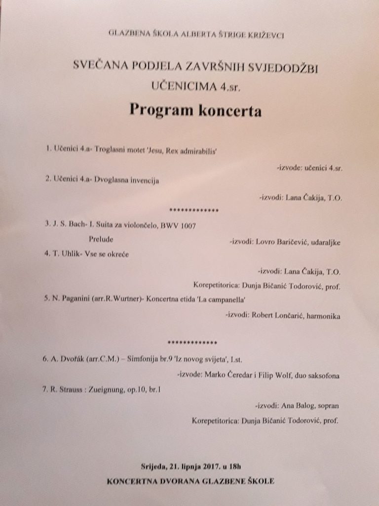 U srijedu, 21. lipnja 2017. u koncertnoj dvorani Glazbene škole Alberta Štrige Križevci u 18 sati je održana svečana dodjela završnih svjedodžbi učenicima četvrtih razreda srednje glazbene škole. Tom prigodom održan je i koncert, na kojem su nastupili maturanti glazbene škole: Lana Čakija na klaviru, Lovro Baričević na udaraljkama, Robert Lončarić na harmonici, Marko Čeredar na tenor saxofonu, Filip Wolf na alt saksofonu i Ana Balog kao sopran.