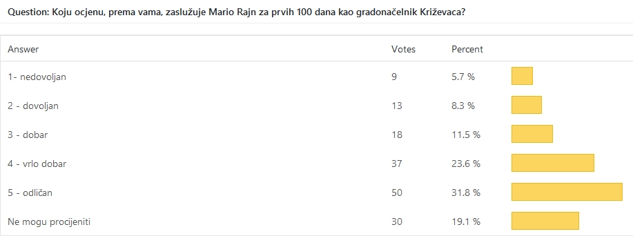 Gradonačelnik Križevaca Mario Rajn za prvih je 100 dana na vlasti od sugrađana zaradio ocjenu – odličan. U prigodnoj anketi na portalu Križevci.info, u kojoj smo od čitatelja tražili da kao u školi, jednostavnom brojčanom oznakom, vrednuju Rajnovo upravljanje u ovom početnom razdoblju tijekom kojeg je tek zasjeo u fotelju, oni su mu poručili – sjedi, 5!