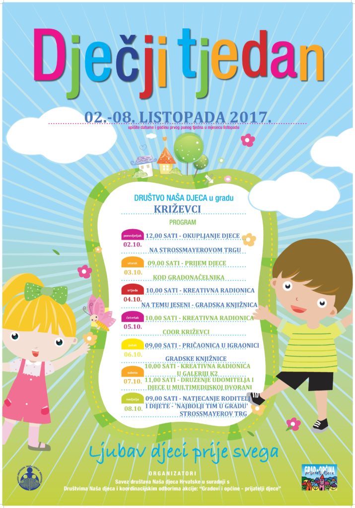 Dječji tjedan već tridesetak godina organizira Savez društva Naša djeca Hrvatske u suradnji s društvima Naša djeca u gradovima i općinama te koordinacijskim odborima akcije Gradovi i općine – prijatelji djece, a ove godine u obilježavanje se uključio po prvi puta i Grad Križevci. Brojnim događanjima za djecu i s djecom od 2. do 8. listopada 2017. godine skrenut će se pozornost društva na položaj djece u društvu koja su, kako je naveo gradonačelnik Mario Rajn na jutros održanoj konferenciji za medije, apsolutni prioritet Gradske uprave: “Sve što radimo je usmjereno prema najmlađima i to je svojevrsni zalog za budućnost”.