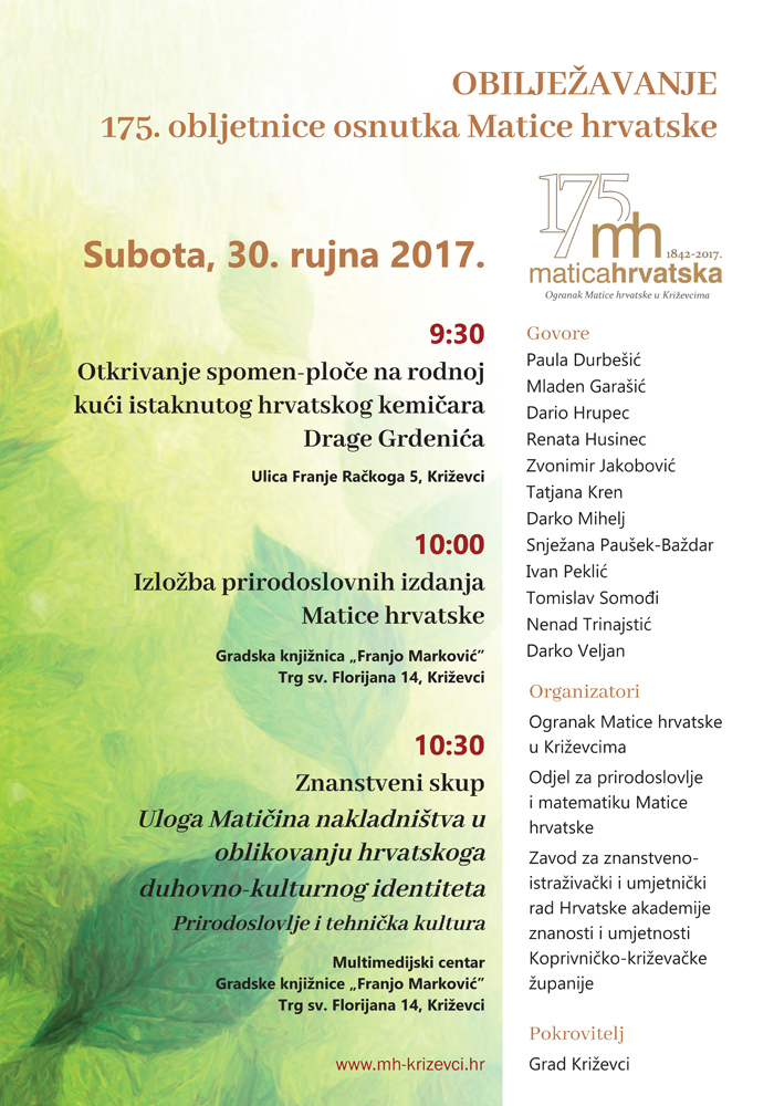 Ogranak Matice hrvatske u Križevcima, Zavod za znanstvenoistraživački i umjetnički rad HAZU-a Koprivničko-križevačke županije i Odjel za prirodoslovlje Matice hrvatske u povodu 175. obljetnice Matice hrvatske pozivaju na znanstveni skup “Uloga Matičina nakladništva u oblikovanju hrvatskoga duhovno-kulturnog identiteta: Prirodoslovlje i tehnička kultura”. Skup će se održati u subotu, 30. rujna 2017. u Multimedijskoj dvorani Gradske knjižnice „Franjo Marković” Križevci, a ulazak je slobodan.