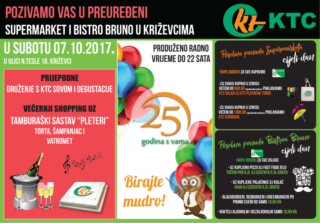 Križevačka obiteljska tvtka KTC koja posluje diljem Hrvatske ove godine obilježava 25 godina poslovanja. U nizu preuređenja i otvaranja novih prodajnih prostora u slavljeničkoj godini iz tvrtke pozivaju na otvorenje potpuno preuređenog prvog KTC supermarketa.