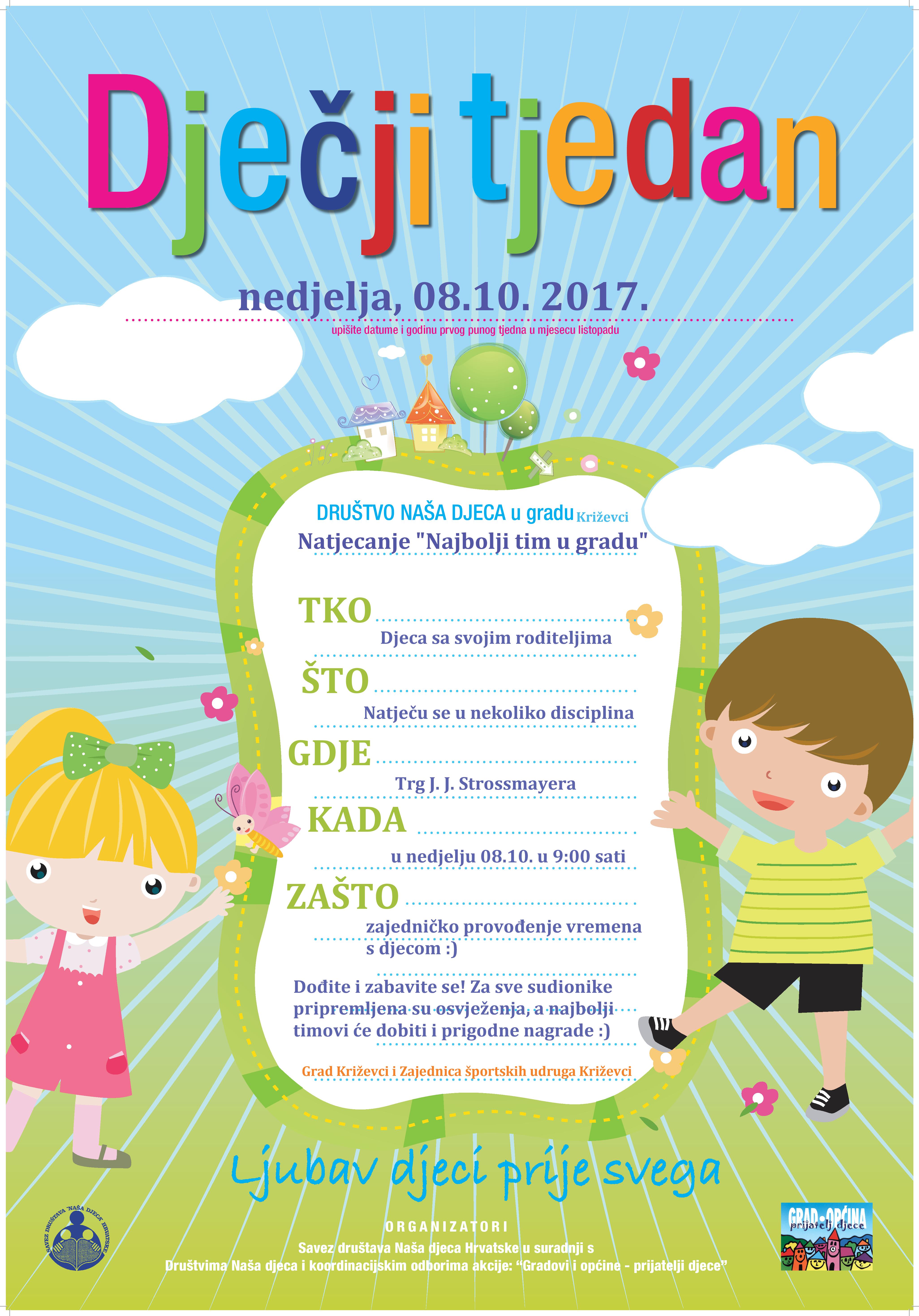 U sklopu Dječjeg tjedna Grad Križevci i Zajednica športskih udruga grada Križevaca u nedjelju, 8. listopada 2017. organizira natjecanje za roditelje i djecu pod nazivom „Najbolji tim u gradu“. Riječ je o natjecanju u kojem se jedan roditelj s jednim djetetom natječe protiv drugih parova roditelja i djeteta. Natjecanje je namijenjeno za djecu od 4. godine pa nadalje, a natjecat će se po kategorijama. Za sve sudionike osigurana su osvježenja, a oni najbolji će dobiti i prigodne nagrade. Cilj je da roditelji i djeca predškolske i osnovnoškolske dobi provedu kvalitetno vrijeme na otvorenom pri tome se zabavljajući i stvarajući zajedničke uspomene. Natjecanje će se održati na Strossmayerovom trgu s početkom u 9 sati.