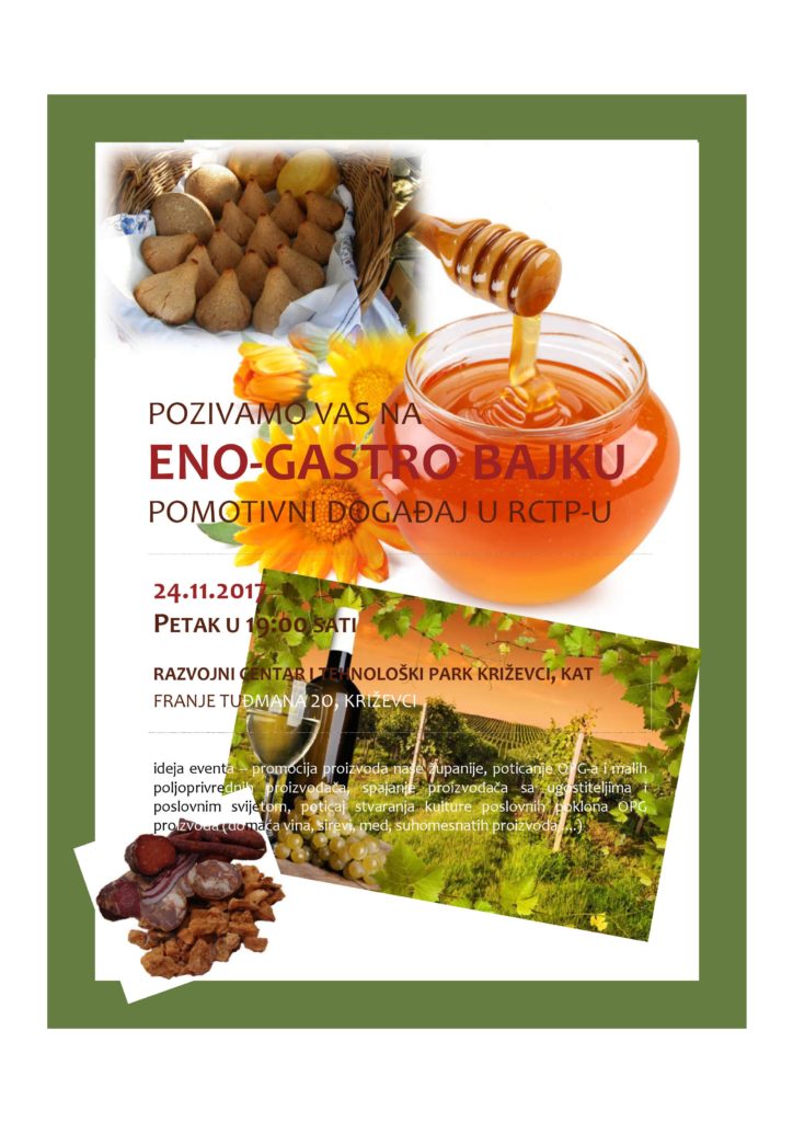 Križevački poduzetnički centar pozvati na drugu po redu manifestaciju “Eno gastro bajka”, koja će se održati u petak, 24. studenog 2017. godine s početkom u 19h u prostorima Razvojnog centra i tehnološkog parka Križevci, Franje Tuđmana 20. Očekuje se tridesetak izlagača s područja cijele Koprivničko-križevačke županije, uz uzvanike poput saborskih zastupnika, župana Koprivničko-Križevačke županije, gradonačelnike gradova Križevci, Koprivnica i Đurđevac te načelnike općina.