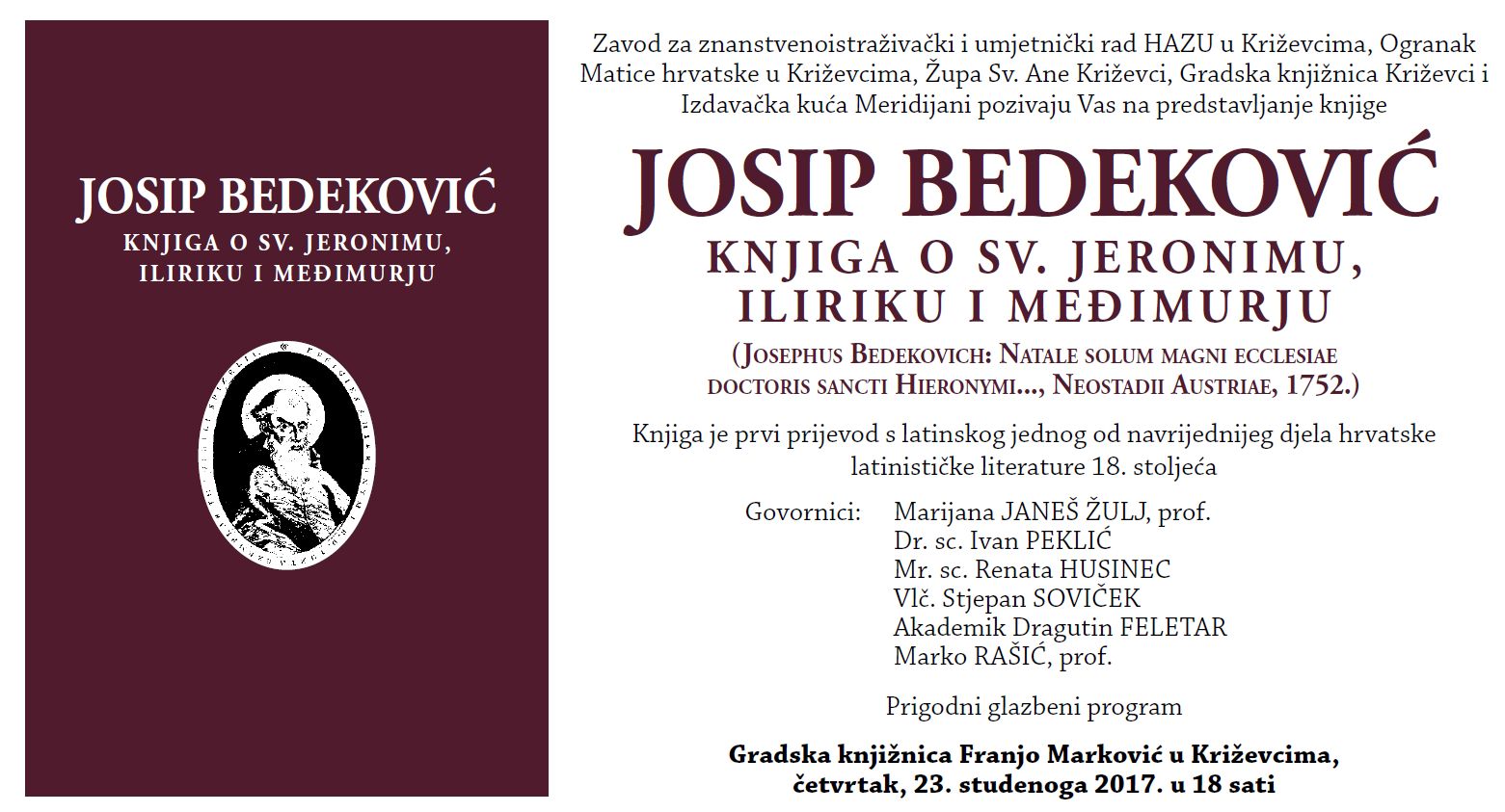 Zavod za znanstvenoistraživački i umjetnički rad HAZU u Križevcima, Ogranak Matice hrvatske u Križevcima, Župa Sv. Ane Križevci, Gradska knjižnica Franjo Marković Križevci te Izdavačka kuća Meridijani pozivaju na predstavljanje knjige Josip Bedeković: Knjiga o Sv. Jeronimu, Iliriku i Međimurju (Josephus Bedekovichz: Natale solum magni ecclesiae doctoris sancti Hieronymi…, Neostadii Austriae, 1752.), koje će se održati večeras u 18 sati u Gradskoj knjižnici.
