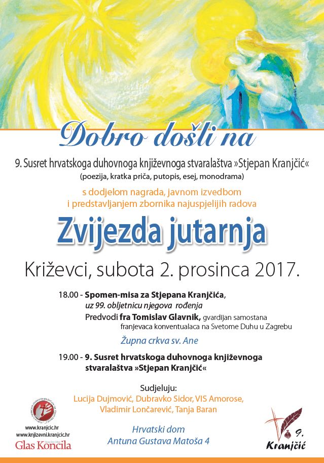 U Križevcima će u subotu 2. prosinca 2017. biti održana završna svečanost 9. Susreta hrvatskoga duhovnoga književnoga stvaralaštva „Stjepan Kranjčić“. Susret će započeti u 17.15 sati okupljanjem autora i sudionika u Maloj dvorani Hrvatskoga doma. Tamo će uz pozdrave domaćina stručni ocjenjivački sud u kojem su bili dr. sc. Vladimir Lončarević, mr. sc. Božidar Petrač i vlč. Drago Bosnar okupljenima predstaviti zbornik najuspjelijih radova pristiglih na natječaj „Zvijezda jutarnja“. Zatim će u 18.00 sati u župnoj crkvi sv. Ane biti služeno misno slavlje koje će uz 99. godišnjicu rođenja župnika Stjepana Kranjčića po kojemu Susret i nosi ime, predvoditi gvardijan samostana franjevaca konventualaca na Svetome Duhu u Zagrebu fra Tomislav Glavnik.
