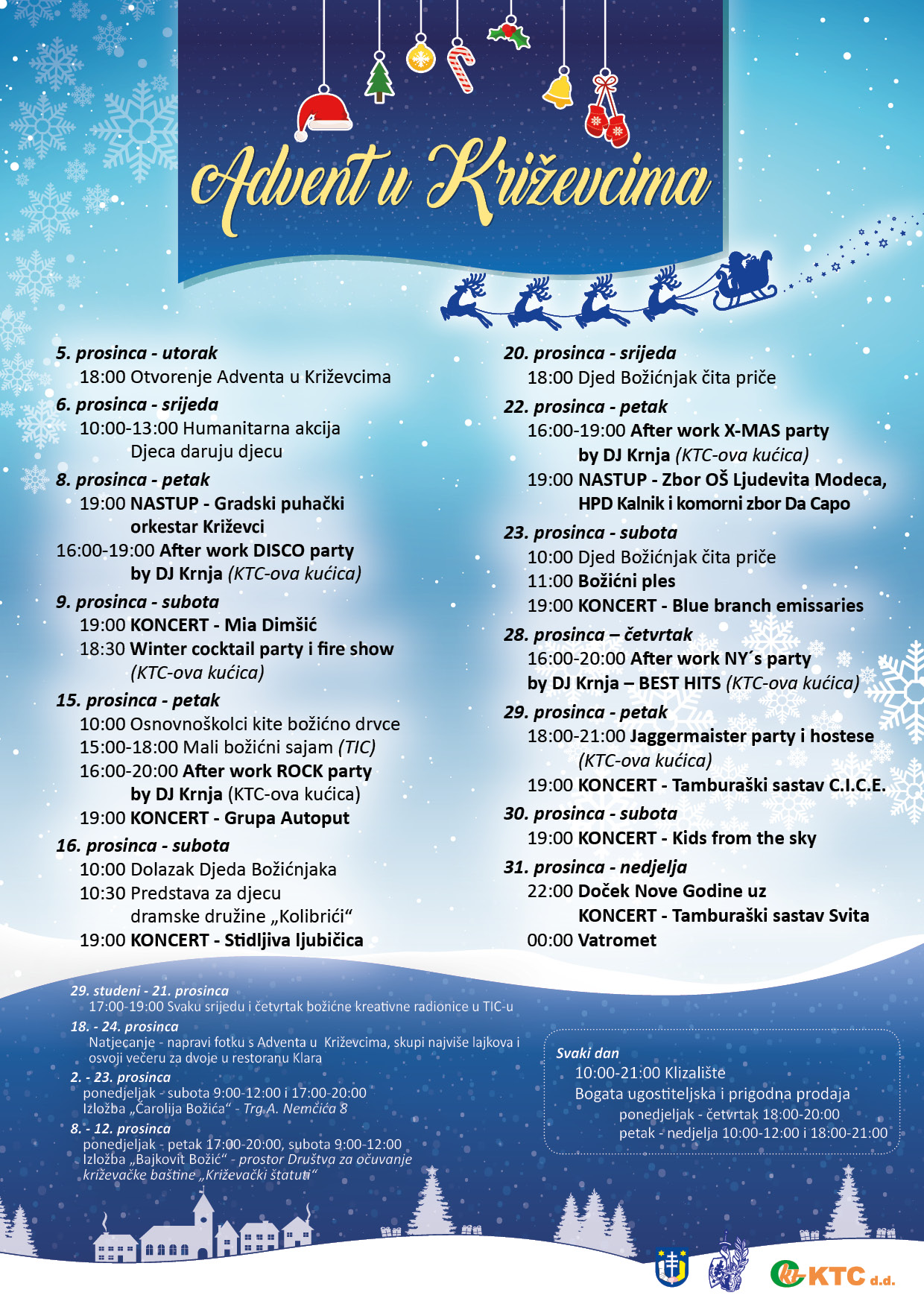 Sutra u 18 sati u paviljonu na Strossmayerovom trgu će se održati svečano otvorenje Adventa u Križevcima, koji će se odvijati sve do 14. siječnja 2018. godine. Otvorenje će biti obilježeno govorima organizatora, svečanim paljenjem lampica kao i puštanjem lampiona. U sklopu programa predviđeni su nastupi glazbenih izvođača, program za djecu, klizalište i bogata ugostiteljska ponuda i prigodna prodaja. Također će se održati humanitarna akcija Djeca daruju djecu, u suradnji s Gradskim društvom Crvenog križa Križevci, a cilj je da djeca doniraju svoje igračke za onu djecu koja žive u siromaštvu.