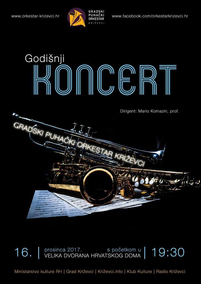 Gradski puhački orkestar Križevci poziva na svoj godišnji koncert koji će se održati u subotu 16. prosinca 2017. u Velikoj dvorani Hrvatskog doma u Križevcima s početkom u 19:30 sati. Na repertoaru će se naći djela R. Sauceda, A. Waignena, A. Reeda, T. Ćićerića i drugih.Na cjelovečernjem koncertu križevačkih puhača solist će biti Lovro Baričević na perkusijama, a dirigent orkestra je profesor Mario Komazin.