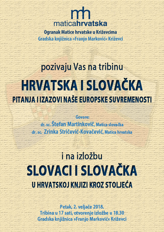 Matica hrvatska, Ogranak Matice hrvatske u Križevcima i Gradska knjižnica “Franjo Marković” pozivaju u petak, 2. veljače 2018. u Gradsku knjižnicu “Franjo Marković” na tribinu “Hrvatska i slovačka, pitanja i izazovi naše europske suvremenosti”, na kojoj će govoriti dr. sc. Štefan Martinkovič, Matica slovačka i dr. sc. Zrinka Stričević-Kovačević, Matica hrvatska, te otvorenje izložbe “Slovaci i Slovačka u hrvatskoj knjizi kroz stoljeća”. Tribina će početi u 17:00 sati, a otvorenje izložbe je u 18:30 sati.