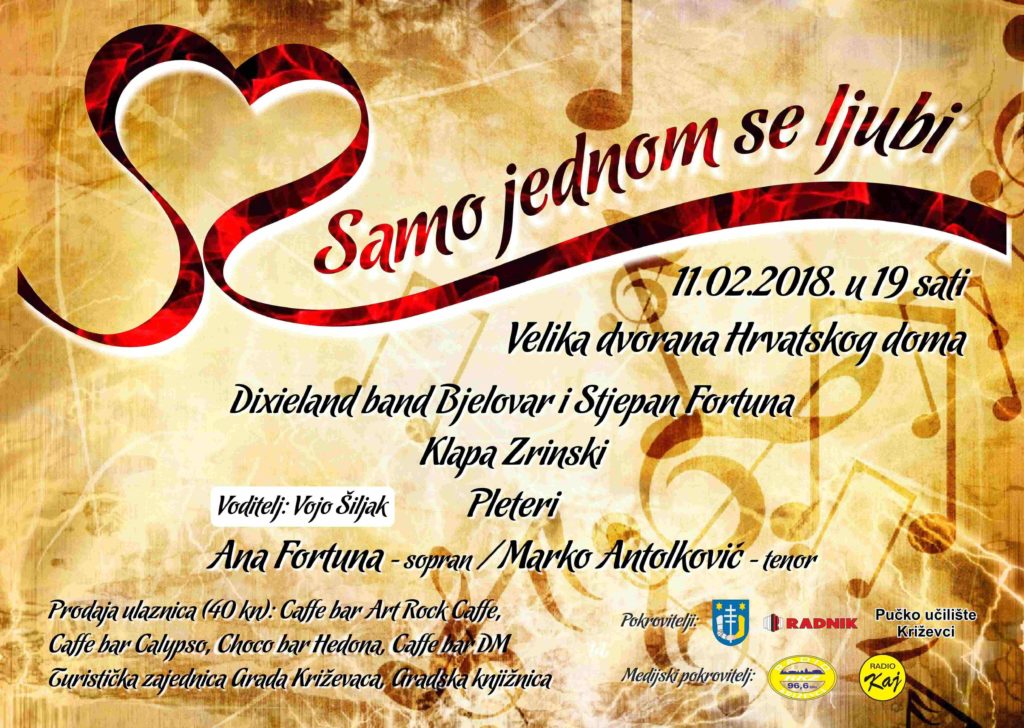 „Samo jednom se ljubi…!“ naziv je velikog koncerta koji će se povodom Valentinova održati u Velikoj dvorani Hrvatskog doma u Križevcima u nedjelju 11. veljače 2018. u 19 sati. Sudjeluju Dixieland band Bjelovar i Stjepan Fortuna, Klapa „Zrinski“, Pleteri, Ana Fortuna – sopran i Marko Antolković- tenor. Voditelj večeri je Vojo Šiljak.