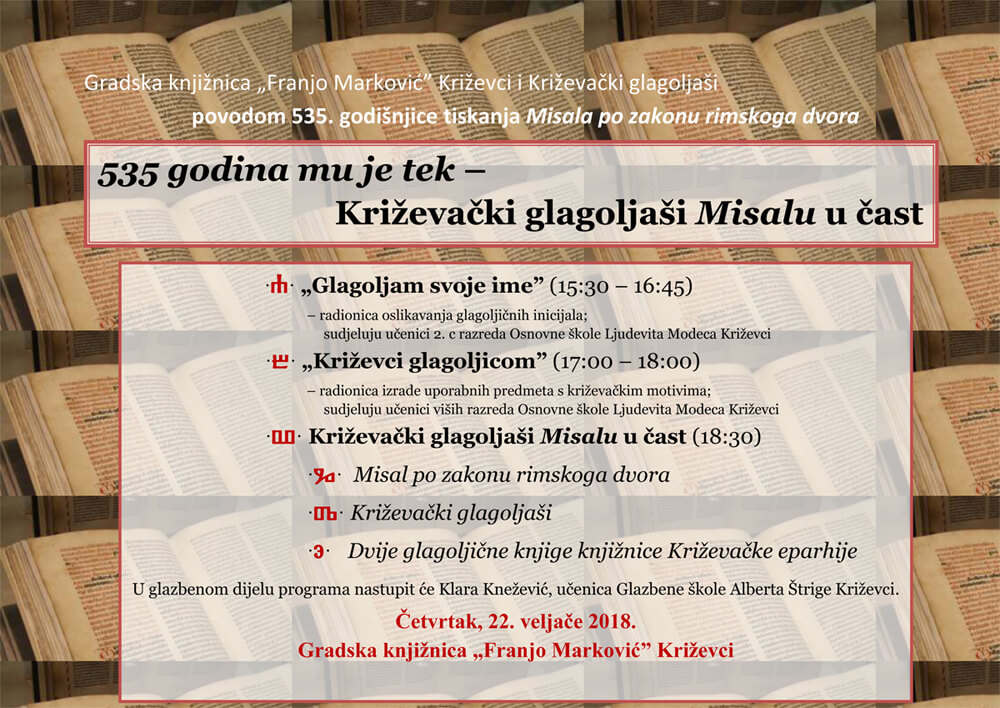 Gradska knjižnica „Franjo Marković“ Križevci i Križevački glagoljaši povodom 535. godišnjice tiskanja „Misala po zakonu rimskoga dvora“ pozivaju Vas na proslavu Misalova rođendana pod nazivom „535 godina mu je tek – Križevački glagoljaši Misalu u čast“.
