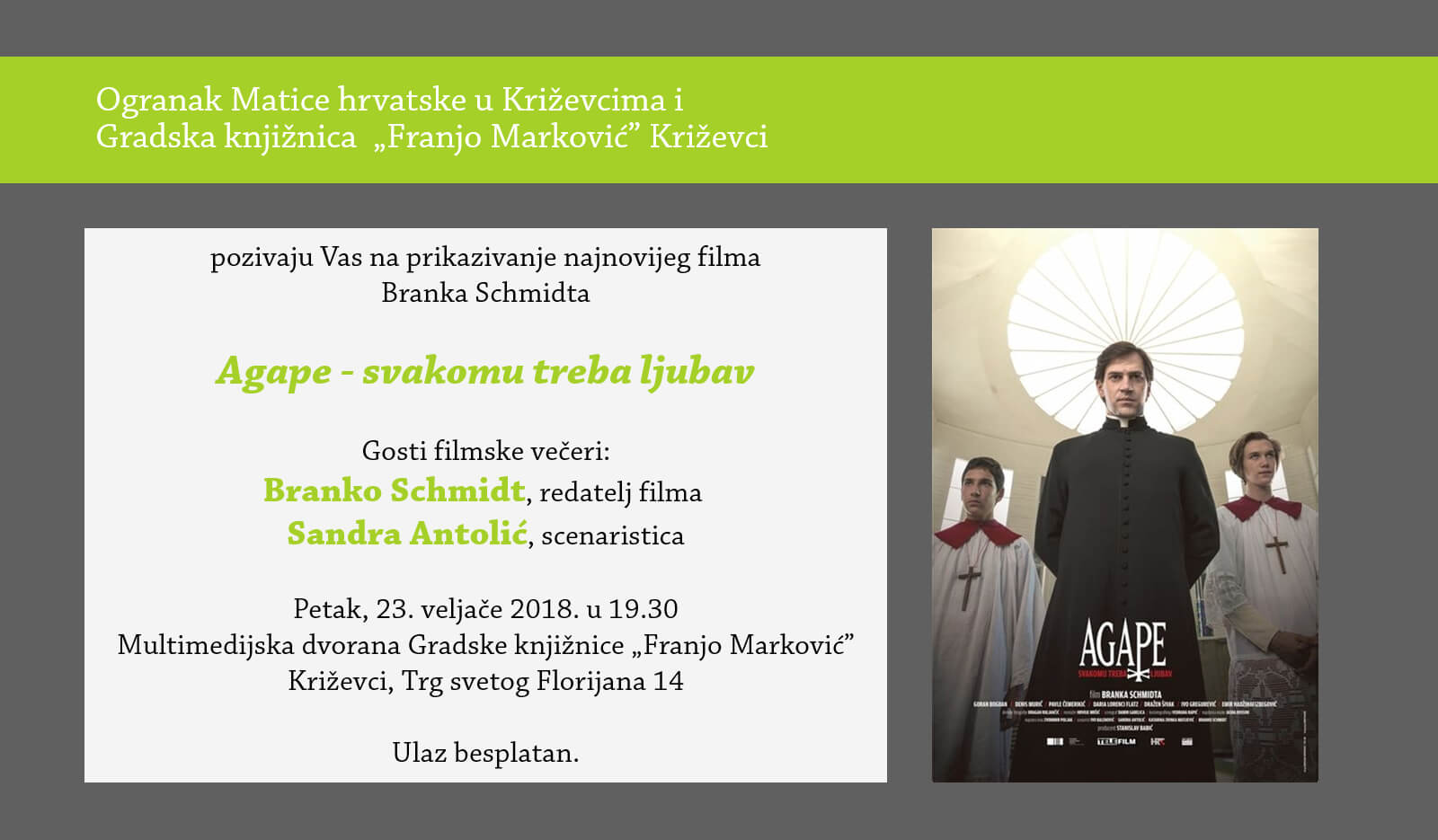 Ogranak Matice hrvatske i Gradska knjižnica “Franjo Marković” pozivaju Vas na prikazivanje najnovijeg filma Branka Schmidta Agape – svakomu treba ljubav. Gosti filmske večeri su Branko Schmidt, redatelj filma i Sandra Antolić, scenaristica. Projekcija će se održati u petak, 23. veljače 2018. s početkom u 19:30 sati u prostorima Multimedijske dvorane Gradske knjižnice “Franjo Marković”, a ulaz je besplatan.