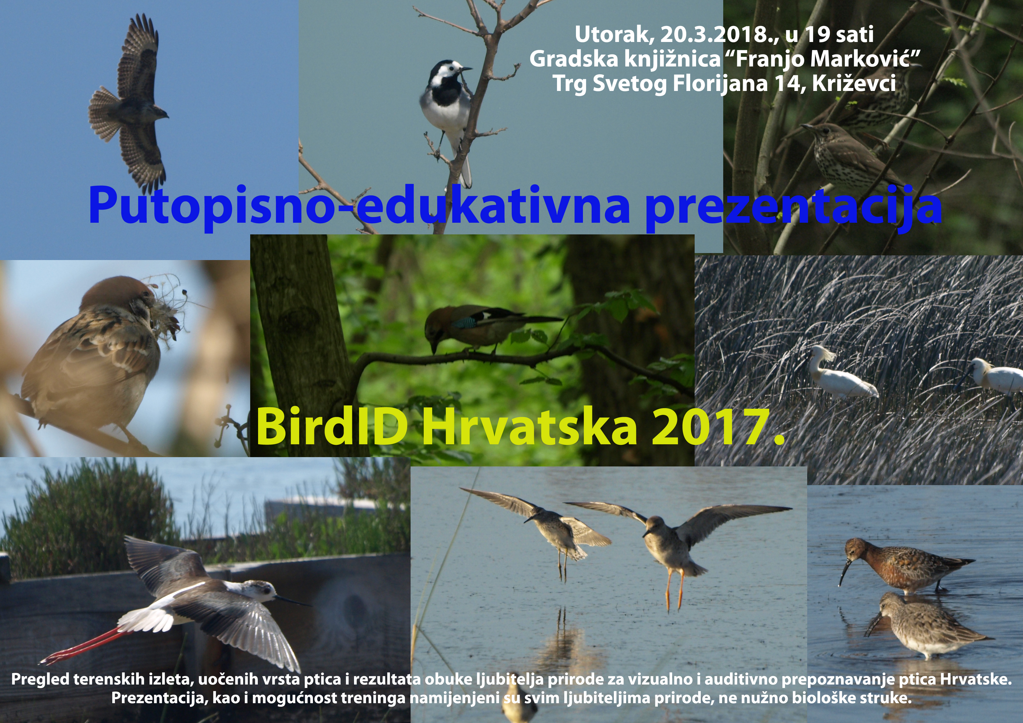 U sklopu programa “Zeleni utorak” u multimedijskoj dvorani Gradske knjižnice “Franjo Marković” Križevci u utorak, 20. ožujka s početkom u 19 sati putopisno-edukativnu prezentaciju BirdID Hrvatska 2017. će održati Darko Podravec. Dat će dati pregled terenskih izleta, uočenih vrsta ptica i rezultata obuke ljubitelja prirode za vizualno i auditivno prepoznavanje ptica Hrvatske. Ulazak na prezentaciju je slobodno.