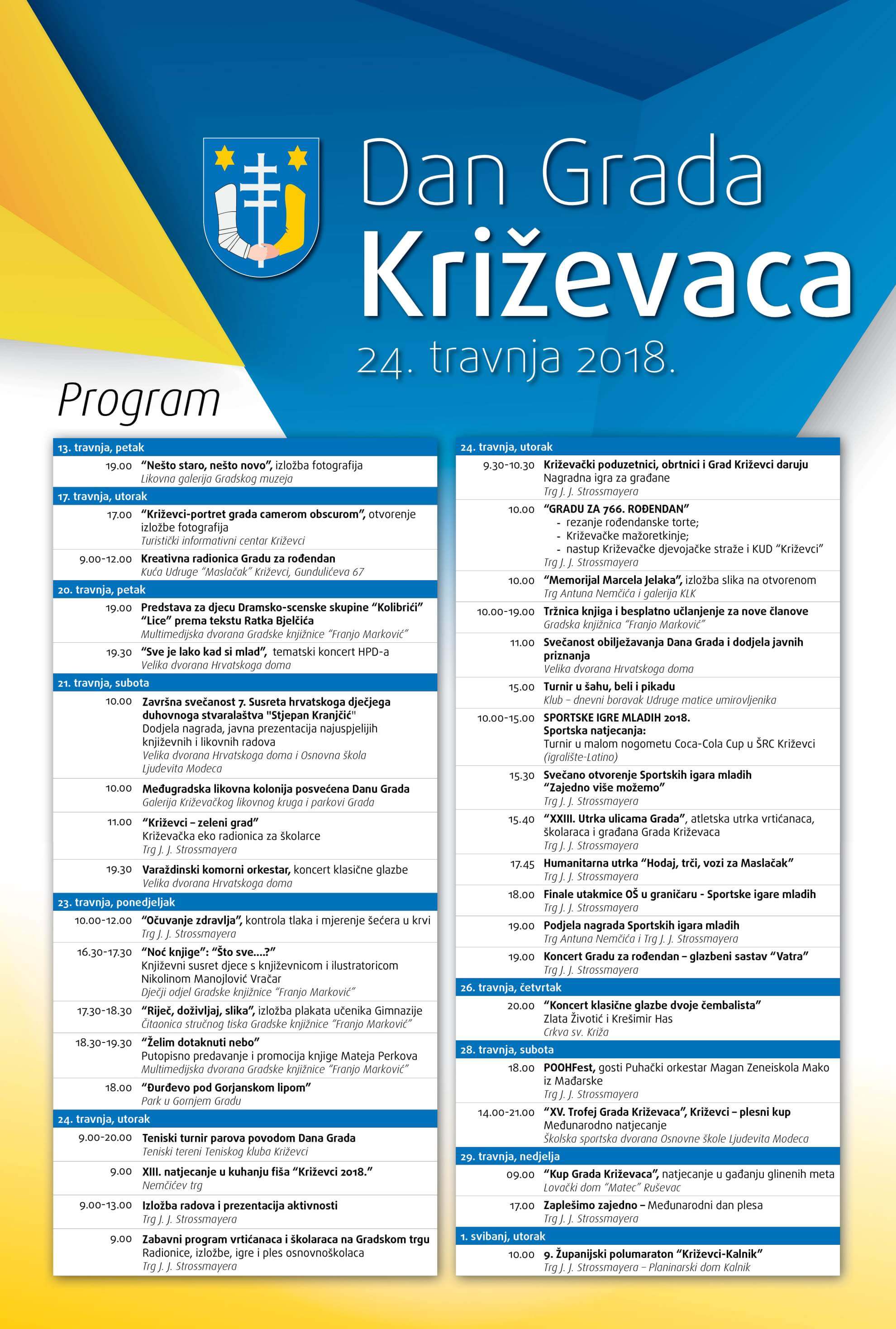 U sklopu programa, održat će se nekoliko radionica, koncerata, izložaba i sportskih događanja. Kako javljaju iz gradske uprave, ono što je posve novo u programu je nagradna igra za građane u organizaciji križevačkih poduzetnika, obrtnika i Grada Križevaca. Naime, na sam Dan grada, 24. travnja od 9,30 do 10,30 na Strossmayerovom trgu bit će postavljen štand na kojem će svaki sudionik, svaki građanin moći odgovoriti na jedno pitanje o Gradu Križevcima i osvojiti poklon koji su pripremili križevački poduzetnici i obrtnici. Osim toga, svi koji će sudjelovati u nagradnoj igri ostavit će kontakt podatke i tako imati mogućnost osvajanja prve i druge nagrade čije će se izvlačenje upriličiti u 19,00 sati na Strossmayerovom trgu uoči koncerta grupe „Vatre“.