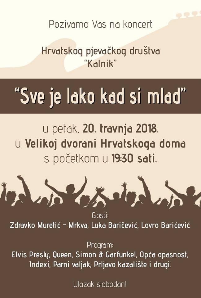 Mješoviti zbor Hrvatskoga pjevačkog društva “Kalnik” poziva na treći tematski koncert, koji će se će se održati u petak, 20. travnja s početkom u 19:30 sati u Velikoj dvorani Hrvatskoga doma, a ulazak je slobodan.